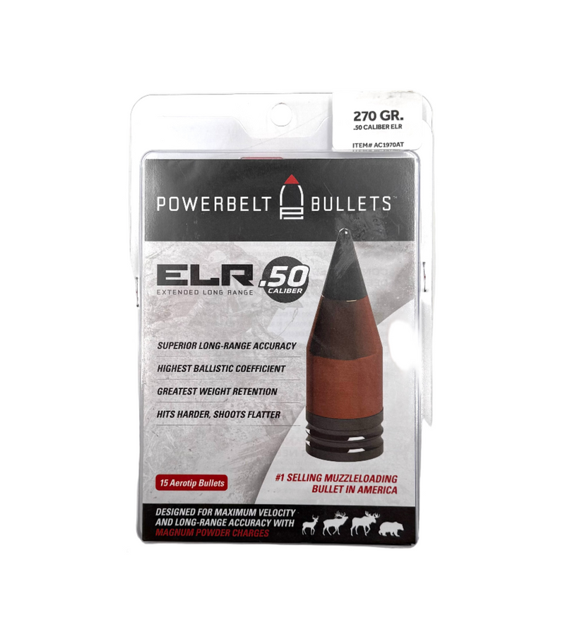 The Powerbelt Bullets .50 caliber 270gr ELR (Extended Long Range) Aerotip Bullets are advanced, copper-plated bullets designed for .50 caliber muzzleloading rifles, delivering exceptional long-range accuracy, expansion, and penetration for hunting or precision target shooting. Featuring an aerotip for superior aerodynamics and a heavy 270-grain weight, these bullets minimize wind drift and ensure consistent performance at extended distances. Each 15-count pack is perfect for hunters and competitive shooters who demand reliability, with the copper construction reducing lead fouling and preserving barrel condition for repeated use.